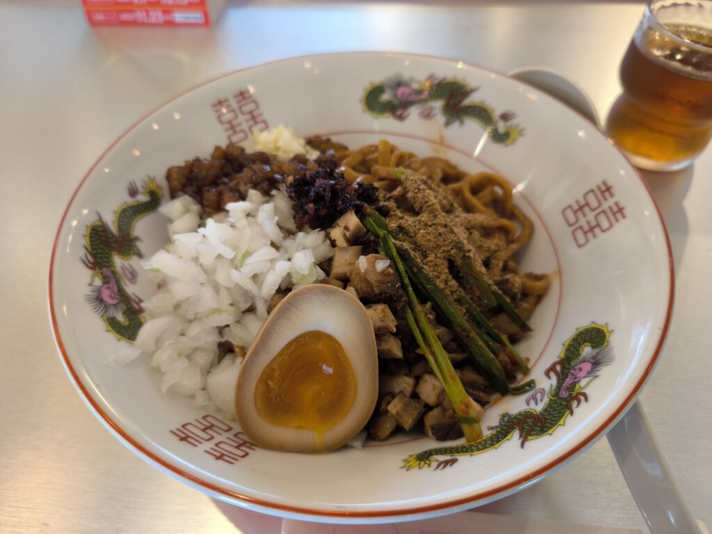 次にいただいたのは「汁なしはなこ」。タレと油がしっかり絡んだ麺を豪快に混ぜ合わせると、食欲をそそる香りが広がります。もちもちとした麺にタレが絡み、タマネギや挽き肉、魚粉が絶妙なハーモニーを醸し出します。