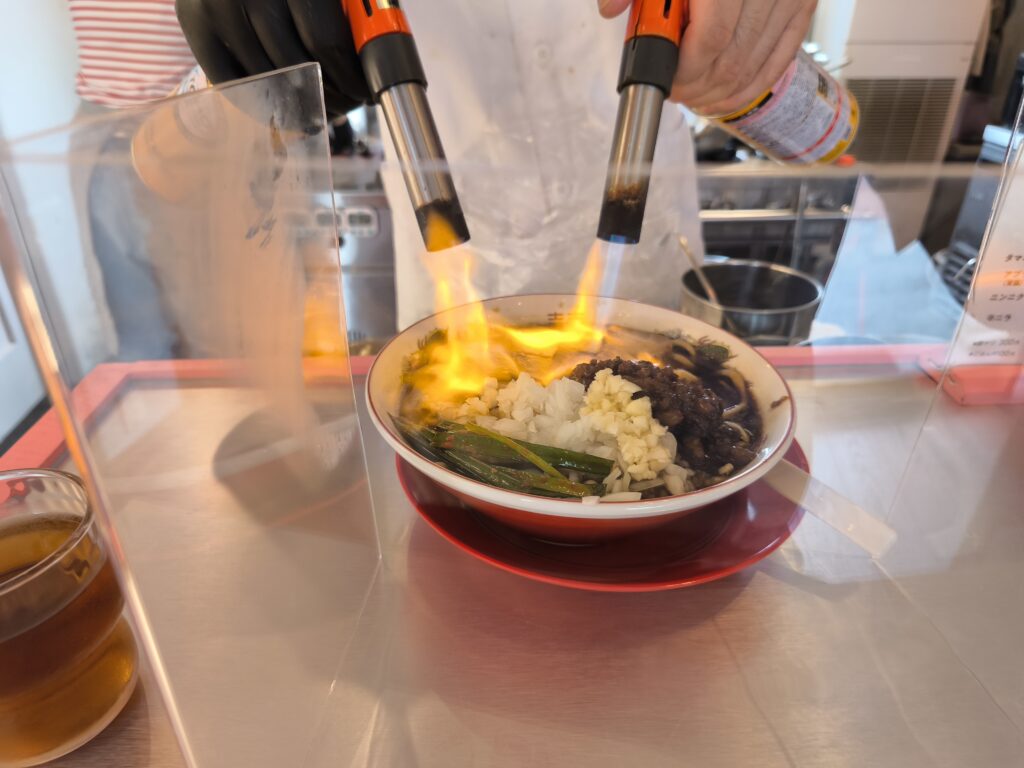 チャーシューはカウンターテーブルの目の前でバーナーで炙っていただけます。バーナーで焦がす香りも食欲を掻き立てます。