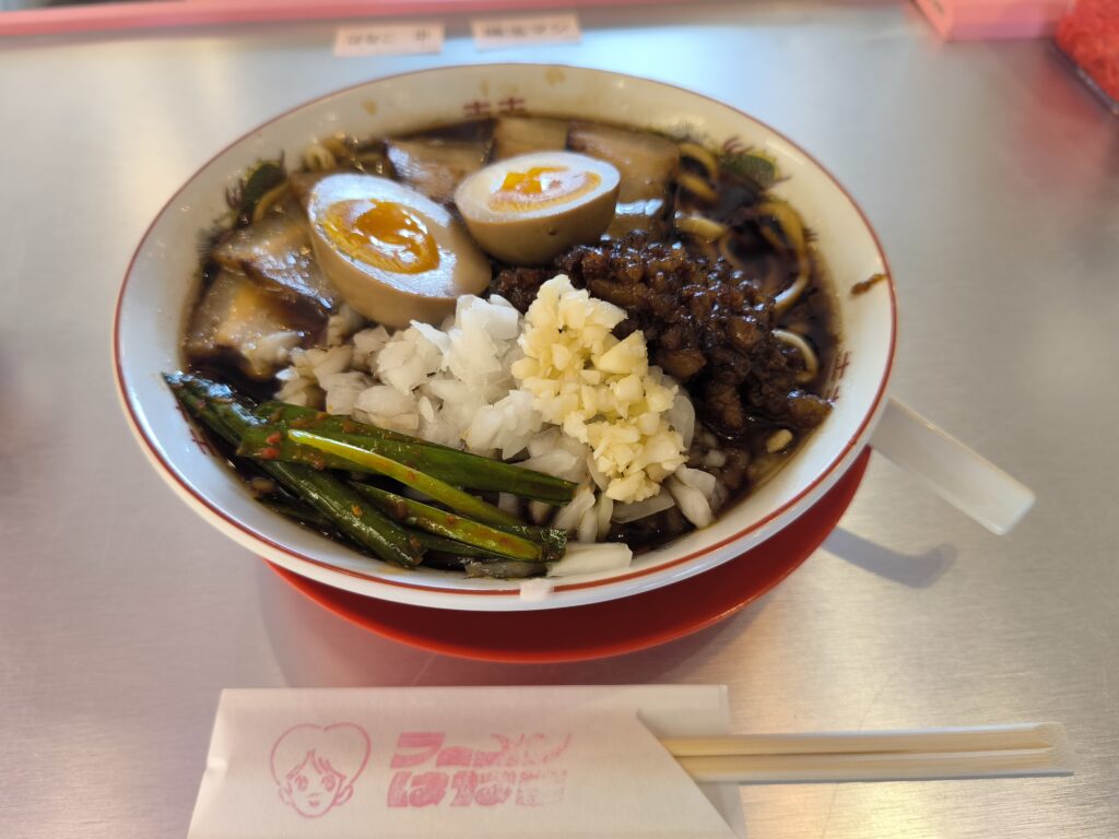 まずはラーメンはなこから。濃いめの色をしている醤油ベースのスープは、太麺によく絡むように考案されているのかなと思いました。注文時に背脂の量、タマネギ、ニンニク、ニラなどの量を調整できるので、自分好みの味を探す楽しみもあります。
